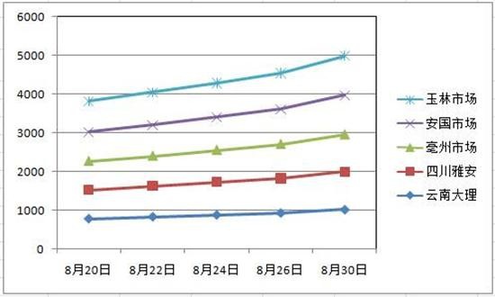 2016年7月25日,鑒于重樓人工種植及野生資源供給量持續下降、家種難以支撐以及企業批量采購等影響,上周重樓已突破千元大關。隨著重樓集中產新結束,重樓價格行情在8月下旬開始發動,從740元-790元(公斤價,下同)價位一路上行,到8 月30日已經達到960元-1020元高位,漲幅高達30%以上!