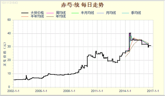 圖3:赤芍近2002年-2016年行情運轉(zhuǎn)示意圖。