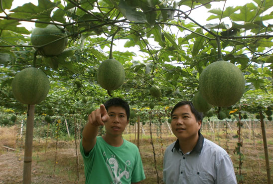 3、搭棚架 當莖蔓高30厘米以上時,用木桿、竹竿,最好是預制的水泥方柱作支柱搭棚架,棚架高1.5米左右。在植株旁,每隔2米立1根柱了,每2行搭設橫架與順架,上耐用 粗鐵絲,架竹竿、樹枝與鐵絲捆牢,搭成棚架。再在每株旁插1根竹竿,上端捆綁在棚架橫竿上,用塑料帶輕捆莖蔓于竹竿上引蔓上架。